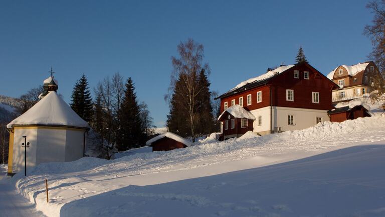 Ještě v roce 1793 si osadníci postavili malý dřevěný kostelík a přenesli sem bohoslužby ze Svatého Petra. Svatopetrskou kapli, založenou už hrabětem Rudolfem Morzinem někdy v polovině 17. století, později zbořili.